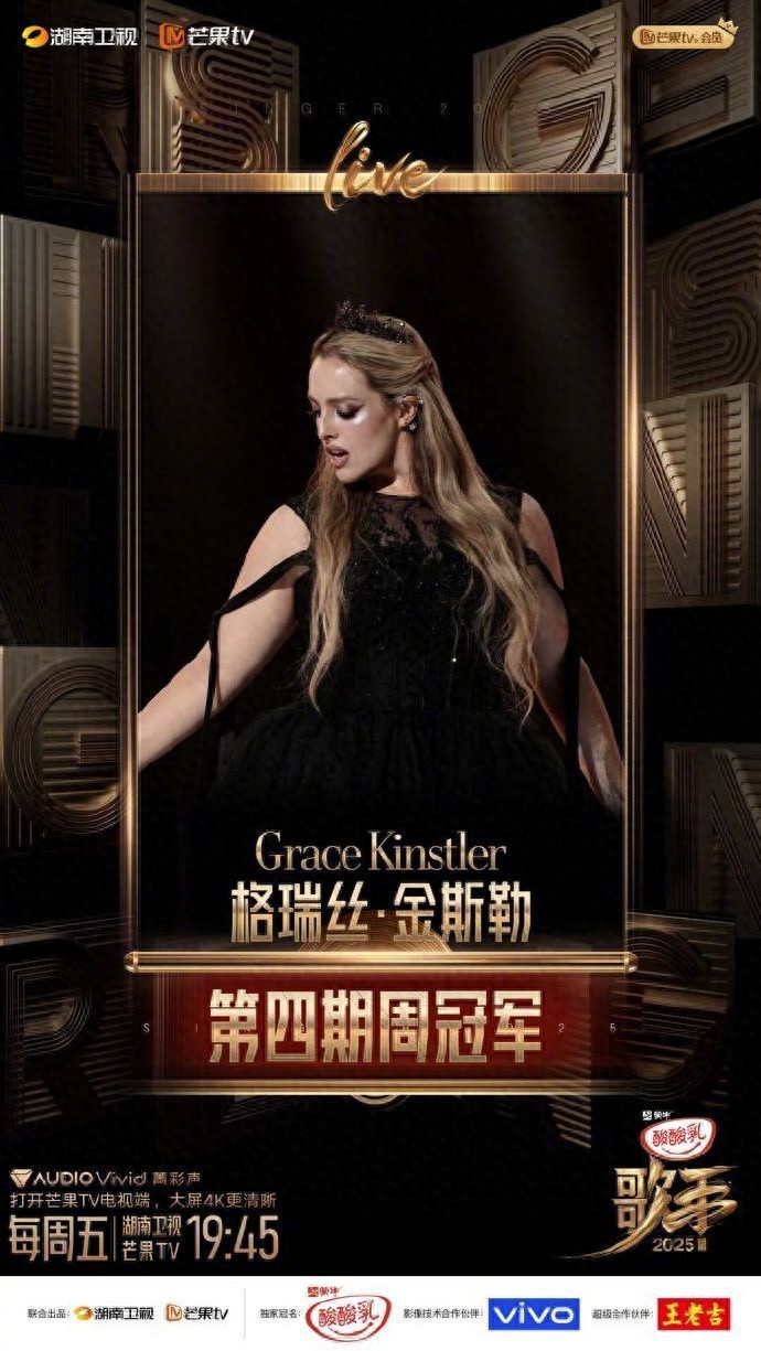 湖南卫视、芒果TV《歌手2025》第四期张榜赛精彩上演,范玮琪、卫兰双补位加入在线歌手阵营,以“青春的BGM”《最初的梦想》和《大哥》点燃舞台。经过激烈角逐,Grace Kinstler格瑞丝·金斯勒成为本期周冠军,范玮琪则遗憾告别舞台。